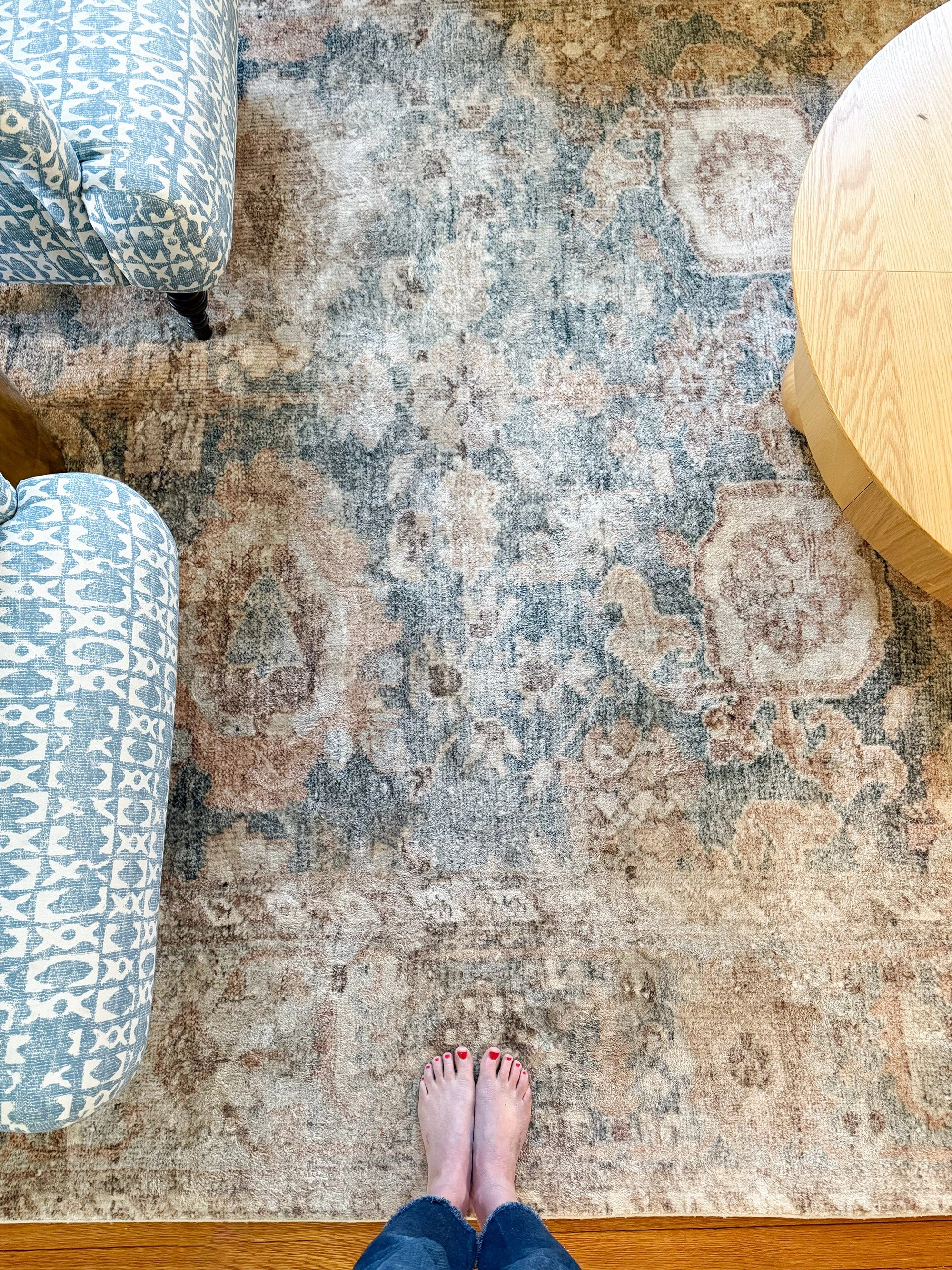 Blue patterned chairs with the Margot rug in our current living room.