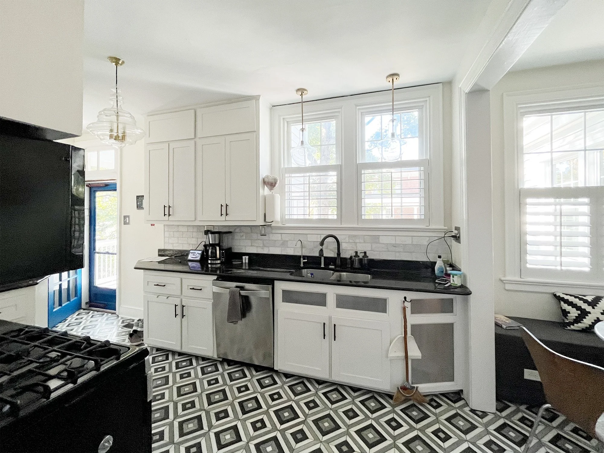 Here’s a view of the sink wall. In the new plan, the sink will stay under these windows - it’s just about the only thing that will stay the same! There’s currently a radiator under the sink, which inhibits a lot of functionality to its right. That’ll be going away with the reno, and we’ll add a pullout trash can to that spot instead.