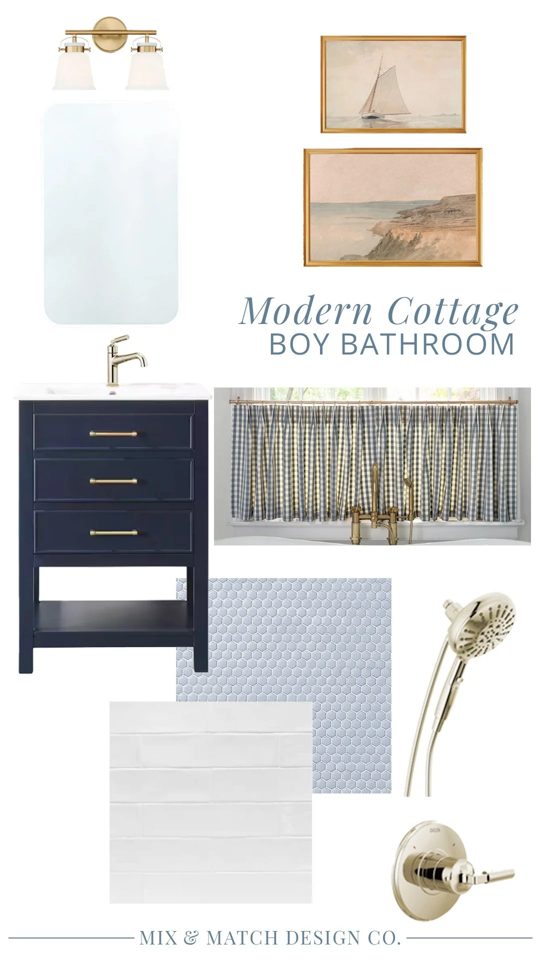 After moving into our new-to-us house, we quickly realized the two bathrooms our kids would be using were in worse shape than we thought, which meant a full gut job for both. These 5’x7.5’ bathrooms got a full makeover, including new plumbing and electrical. We converted my son’s tub into a standup shower and my daughter got a new, low-profile tub that will allow it to act more like a shower one day when she’s older. You can see all the before photos here and below are the plans I shared at the start of the project!