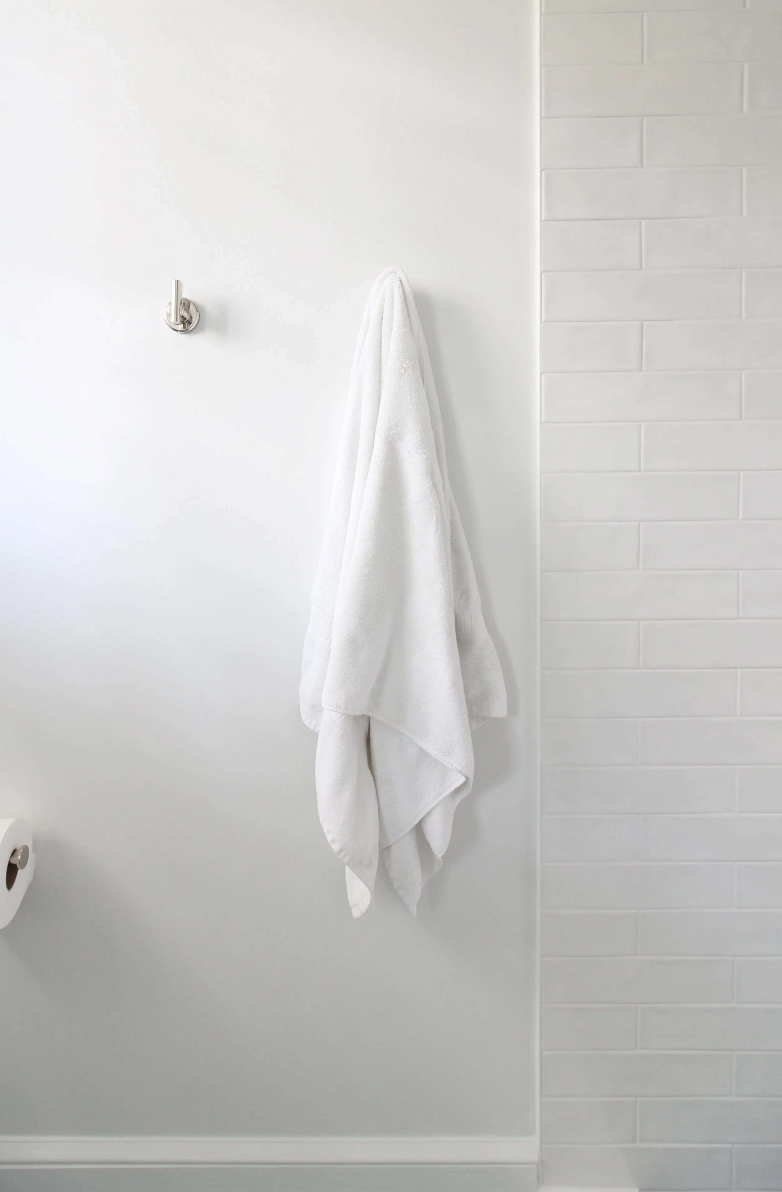 Our tile guys did such a nice job here - I love the crisp edge of the tile here. It gives it that slightly modern flair. We added two hooks next to his shower for towels. There’s just enough wall space in this tiny bathroom for those!