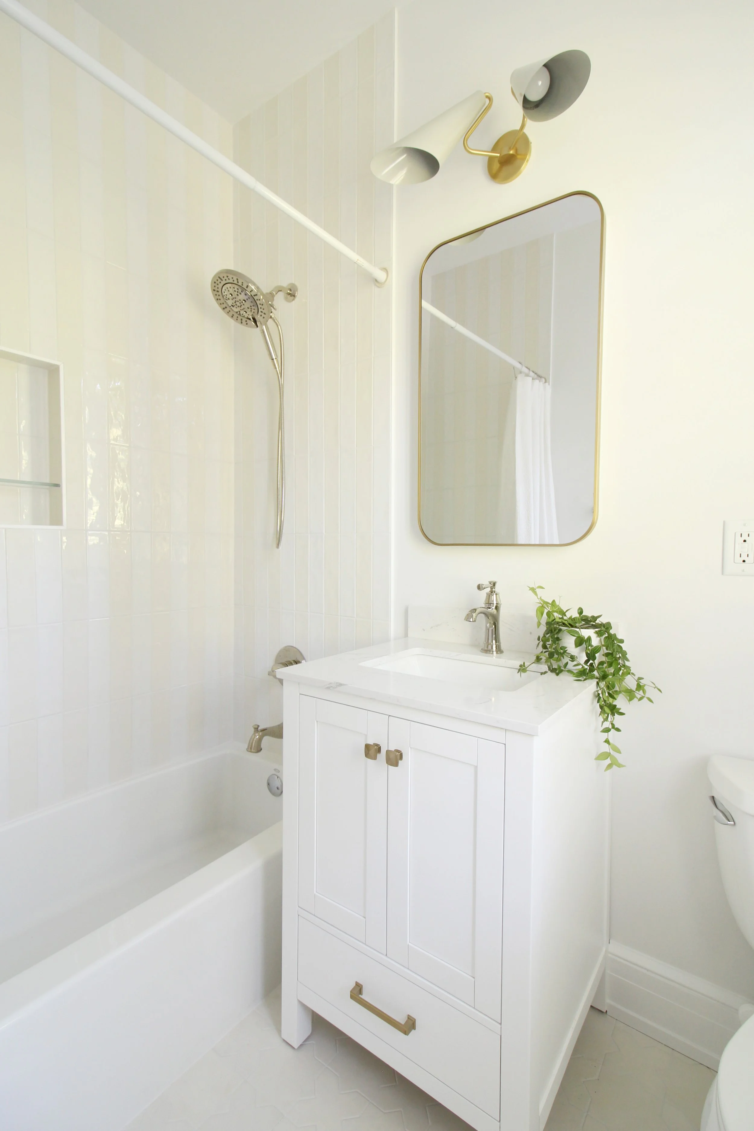 The star of the show at the moment is definitely the striped tub/shower walls I created with a mix of white and ivory subway tiles! I’ve had this vision for so long and it’s such a treat to see it come to life. Before I committed to this idea, I ordered samples of each tile to make sure the colors were right. I always recommend this before making a big purchase like tile!