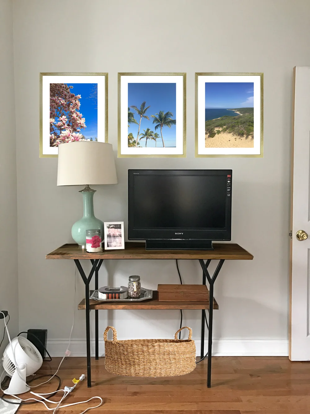 The TV is finally getting a permanent home after occupying a space on the floor for way too long (yikes!). We don't watch a lot of TV, so having it in the office for occasional use is perfect for us. I found a great two shelf console table at HomeGoods for it, but I think the wood is a little too light. I did a little bit of photoshopping to show what it would look like in a darker stain or painted white, and added in the brass frames that will eventually hang on the wall behind it. I haven't made the final call yet on what to do with that piece, so if you have an opinion, now is the time to share it!
